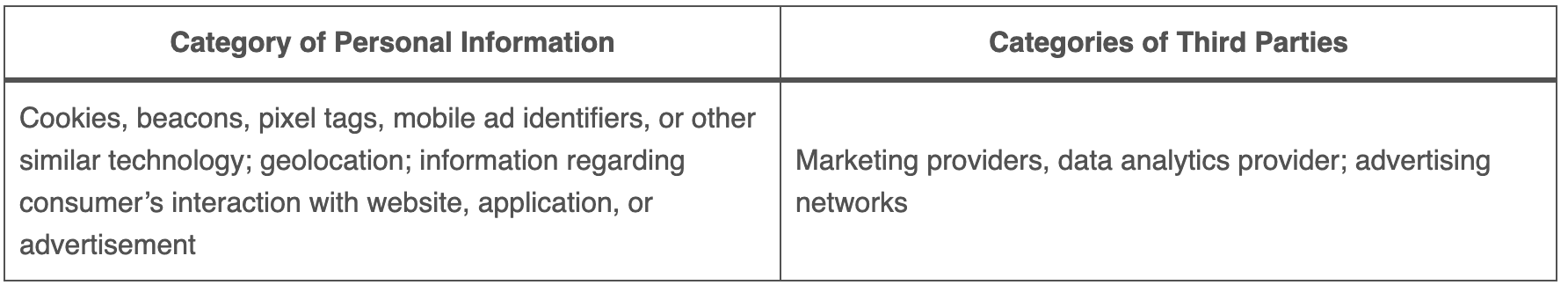 The following table identifies the categories of Personal Information that we sold or shared to third parties in the 12 months preceding the Last Updated Date of this Notice and, for each category, the categories of third parties to whom we sold or shared Personal Information: