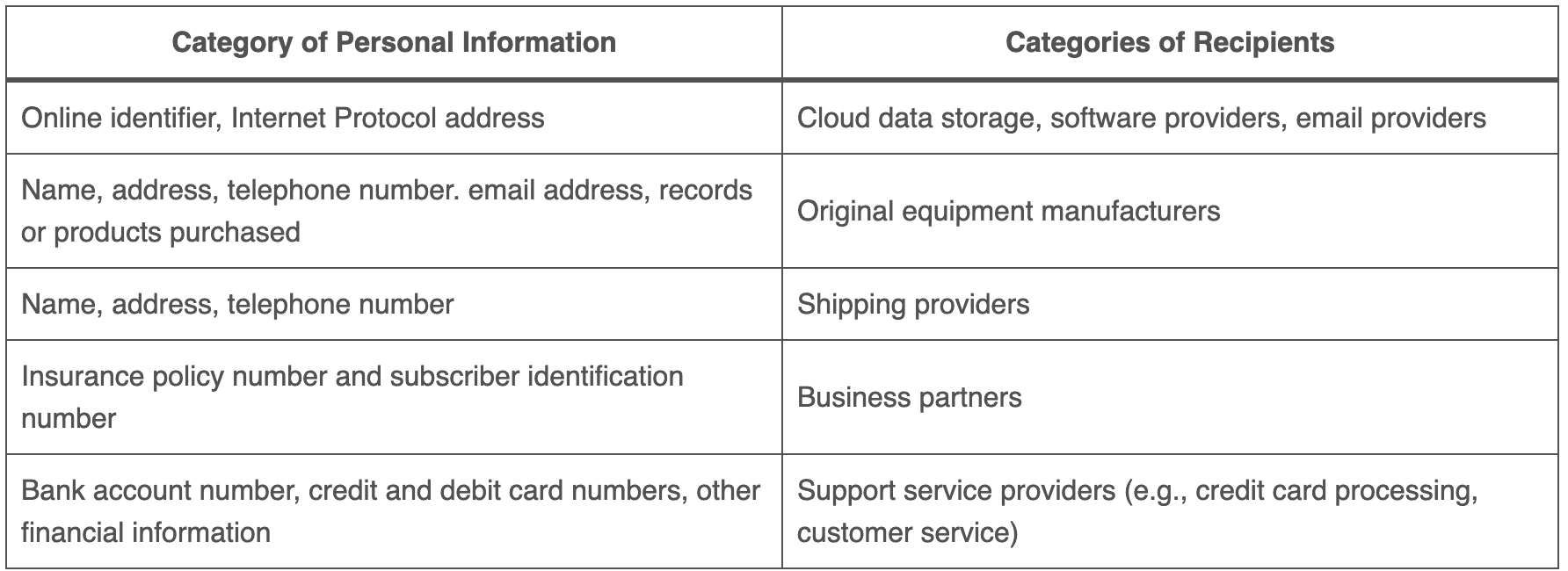 The following table identifies the categories of Personal Information that we disclosed for a business purpose in the 12 months preceding the Last Updated Date of this Notice and, for each category, the categories of recipients to whom we disclosed Personal Information.